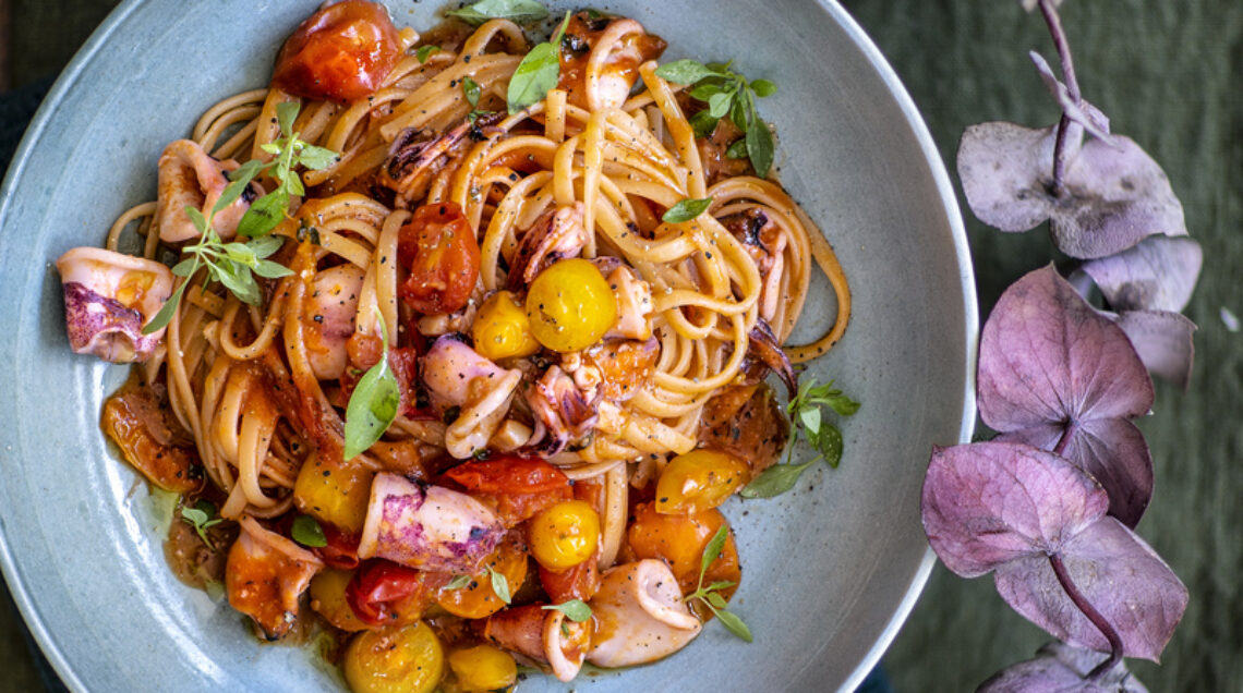 Un sughetto di pesce con pomodorini spadellati al profumo di aglio e menta. Perfetto per gli spaghetti, da gustare con gli amici