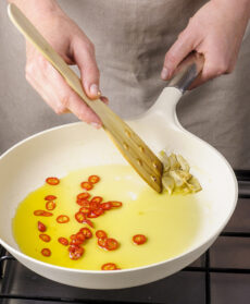 Aprite ed eliminate i semi di 3 peperoncini rossi piccanti, poi tagliateli a fettine. Sbucciate 3 spicchi di aglio e tagliate anche questi a fettine. Fate soffriggere in una casseruolina con 3 cucchiai di olio l'aglio finché diventa dorato, poi unite all'olio i peperoncini ed eliminate l'aglio.