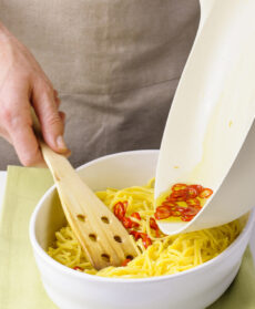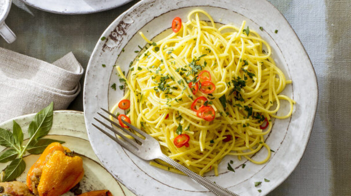 Normalmente quando si parla di "pasta aglio olio e peperoncino" si pensa immediatemente agli spaghetti, noi qui vi proponiamo invece una versione di questo primo con delle gustose linguine come base.