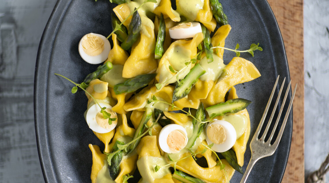5) Nel frattempo, frullate i gambi degli asparagi con i capperi rimasti, 4 uova di quaglia, 4 cucchiai di olio, 1 cucchiaio di succo di limone. Allungate la salsa con un po' di acqua di cottura degli asparagi, regolate di sale. Cuocete i ravioli in acqua bollente salata, scolateli, conditeli con la crema di asparagi, le punte di asparago tagliate a metà, le foglioline di menta rimasta, le uova di quaglia restanti tagliate a metà, olio e pepe.