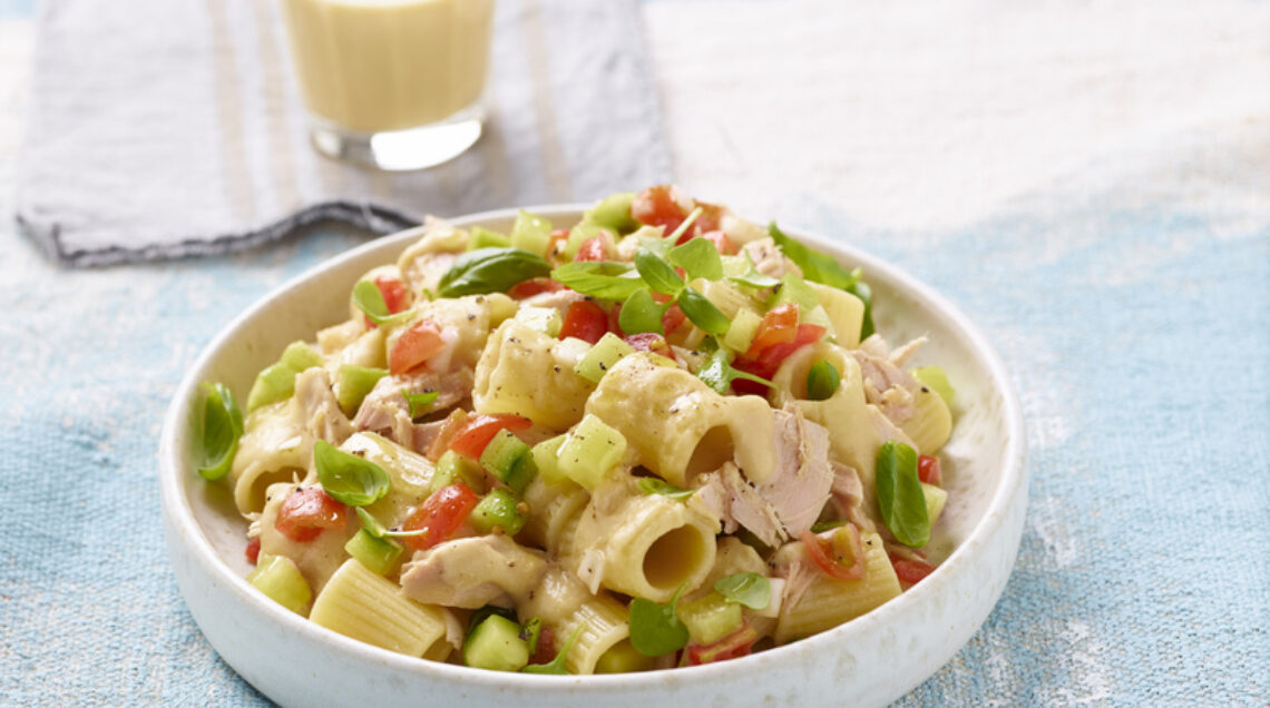 3 Cuocete i mezzi rigatoni in acqua bollente salata, scolateli al dente e conditeli con la crema di cannellini, le verdure, il tonno a pezzetti, le foglie del basilico, un filo d'olio e una macinata di pepe.