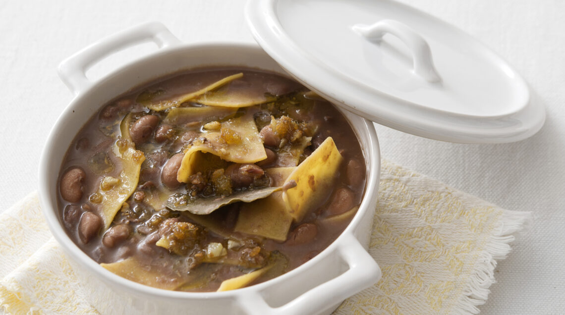 Minestra di gramigna, ceci e prosciutto