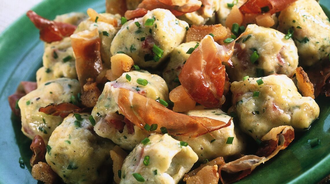 4) Scola i canederli dal brodo di cottura con un mestolo forato, lasciali sgocciolare un istante in un colino e disponili su un largo piatto di portata caldo; condiscili con il lardo, lo speck e l'erba cipollina. Servi subito i tuoi canederli tirolesi.