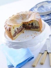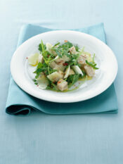 2) Aggiungi 70 g di speck tagliato a listarelle e poi tritato grossolanamente, il salame ridotto a dadini, metà dell'erba cipollina tagliuzzata, il prezzemolo tritato fine, un pizzico di sale e una grattatina di noce moscata; mescola e incorpora poco alla volta la farina: devi ottenere un impasto non troppo umido.