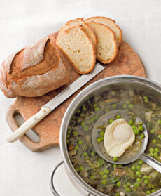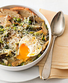 Nel frattempo, taglia il pane a fette sottili e disponile in 4 ciotole. Porta a bollore un pentolino d’acqua con poco sale e un paio di cucchiai di aceto. Sguscia un uovo in un piattino e fallo scivolare delicatamente nell’acqua, raccogliendo l’albume intorno al tuorlo con un cucchiaio. Appena l’albume si sarà rappreso (2-3 minuti), sgocciola l’uovo con un mestolo forato e adagialo su carta da cucina. Prepara allo stesso modo le altre uova.