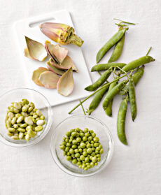Per preparare la minestra bazzoffia sgrana i piselli e le fave. Scotta queste ultime in acqua bollente per 30 secondi ed eliminate la pellicina che le ricopre. Pulisci i carciofi e tagliali a fettine. Lava le coste e la lattuga, asciugale e riducile a striscioline. Sbuccia e trita la cipolla.