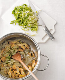 Fai appassire la cipolla in una casseruola con un filo d’olio. Aggiungi i carciofi, le coste, i legumi e la lattuga. Sala, fai insaporire mescolando, unisci 5 dl di acqua calda e lascia cuocere a fuoco basso, semicoperto, per un’ora abbondante.