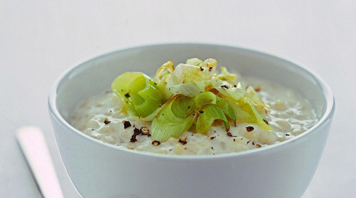 1) Suddividi l'orzo, che dovrà rimanere cremoso, nei piatti fondi, distribuisci sopra i porri rosolati, cospargi la minestra con una abbondante macinata di pepe fresco e servi in tavola.