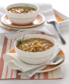 Suddividi la pasta e fagioli in ciotole individuali, insaporiscila con una abbondante macinata di pepe, il rametto di rosmarino rimasto spezzettato con le mani e un filo di olio crudo.