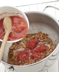 Sgocciola e riduci a pezzetti i pomodori pelati, poi uniscili al soffritto insieme ai fagioli. Versa nella casseruola 2 litri di acqua fredda, porta a bollore e prosegui la cottura per circa 1 ora e 15 minuti, mescolando ogni tanto, finchè i legumi saranno teneri. Regola di sale.