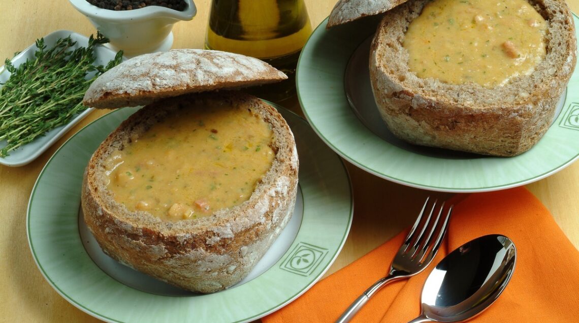4) Infine distribuisci la zuppa nei panini, irrora con l'olio rimasto e servi i pasticci rustici nei piatti singoli con accanto le calottine.