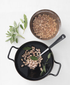 Mettete i fagioli a bagno in abbondante acqua per una notte. Quindi sciacquateli, versateli in una pentola con l'alloro, la salvia e 2 litri d'acqua (non salata) e cuoceteli lentamente finché saranno quasi sfatti (circa 1 ora).