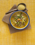 3) Scalda 4 cucchiai di olio in una pentola e fai appassire le verdure preparate a fuoco moderato, mescolando e facendo attenzione che non prendano colore. Unisci il farro, versa tre quarti del brodo freddo, porta a bollore e cuoci per 15 minuti.