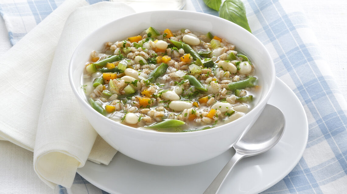 1) Per il minestrone di farro e basilico, fai ammollare i fagioli per una notte in acqua fredda, poi lavali, mettili in una pentola con 2 bicchieri di acqua e la salvia e cuocili per circa 1 ora a fuoco dolce. Fai ammollare il farro per 5-6 ore (non necessario se utilizzi quello perlato). Taglia a cubetti il sedano, le carote e la zucchina. Trita la cipolla.
