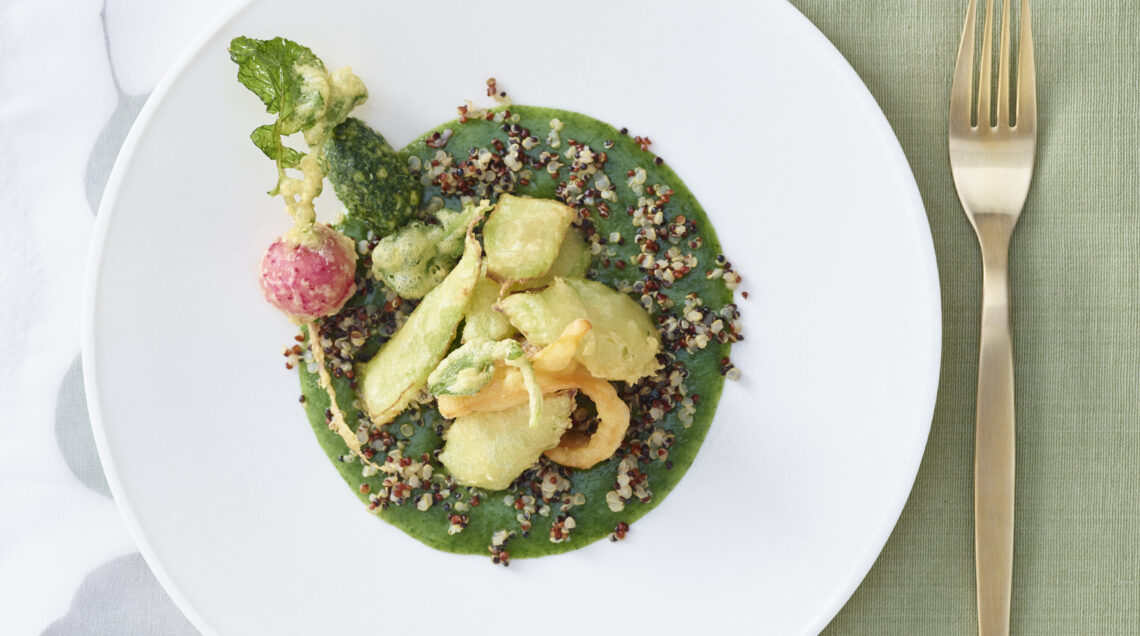 La quinoa con vellutata di foglie, pesto e tempura di broccoletti è un primo vegano gourmet. Un piatto da gustare al cucchiaio