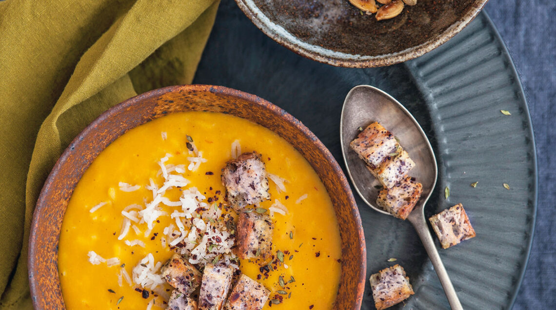 3 Pulite i semi della zucca dai filamenti, sciacquateli, tostateli in padella con 1 cucchiaio d'olio e salateli. Preparate lo za'atar miscelando 1 cucchiaio di timo secco, 1 cucchiaio di sommacco in polvere, 1 cucchiaini di semi di sesamo, olio e 2 cucchiaini di sale. Private il pane della crosta, tagliatelo a dadini, dorateli sotto al grill e conditeli con 1 filo d'olio e una spolverizzata di za'atar. Eliminate dalla zuppa la cannella, frullate, unite il riso lessato e servite con i crostini, i semi e un pizzico di za'atar.
