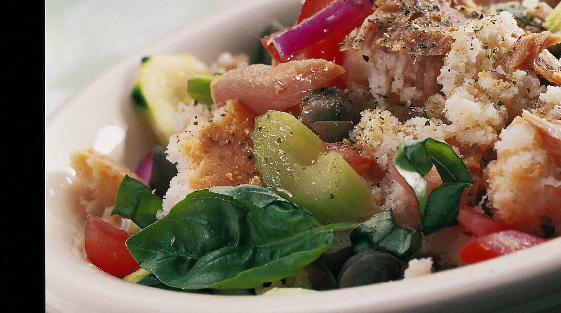 4) Servi la panzanella toscana fredda, guarnita con qualche foglia di basilico intera.