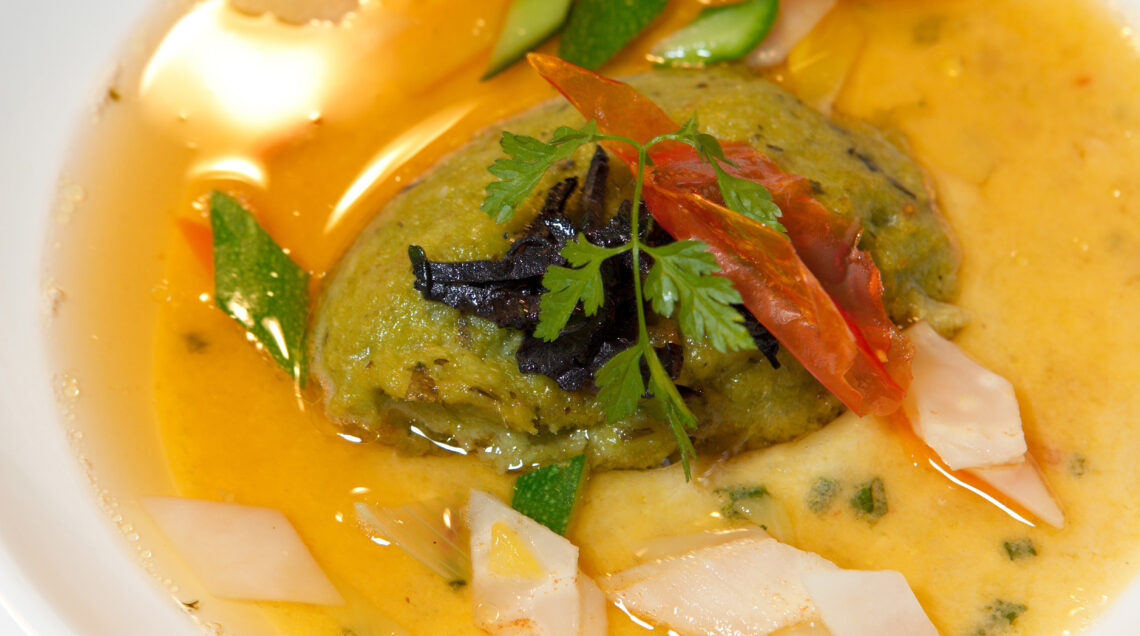 5) Per la presentazione: distribuisci la royale nei piatti individuali, suddividi in ogni piatto le quenelle, le verdure, le erbe, il tartufo nero e le bucce di pomodoro cristallizzate; porta in tavola e termina davanti ai commensali versando al momento il consommé bollente.