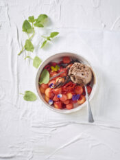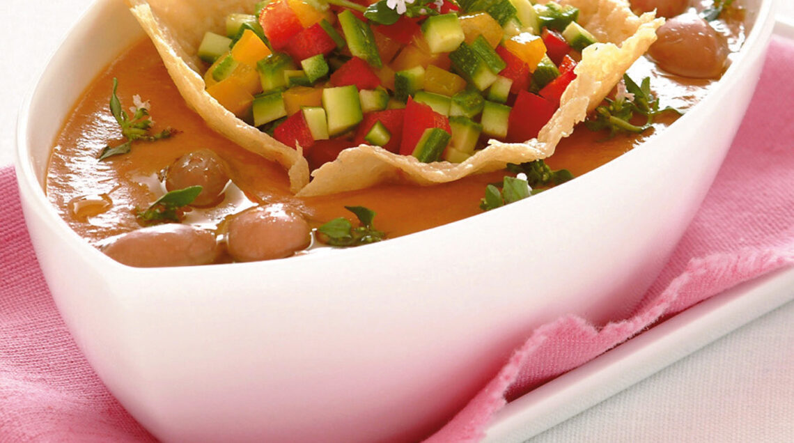 6) Frulla la vellutata di fagioli, suddividila in 4 ciotole, disponi al centro le cialde di formaggio e riempile con le verdure.