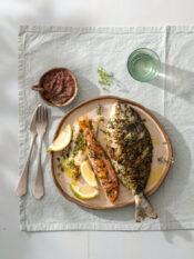 4) Prepara la tartara di zucchine e peperoni tritando zucchine e peperoni e mescolandoli con 2 cucchiai di olio e i fagioli tenuti da parte. Infine, aggiusta di sale e lascia raffreddare.