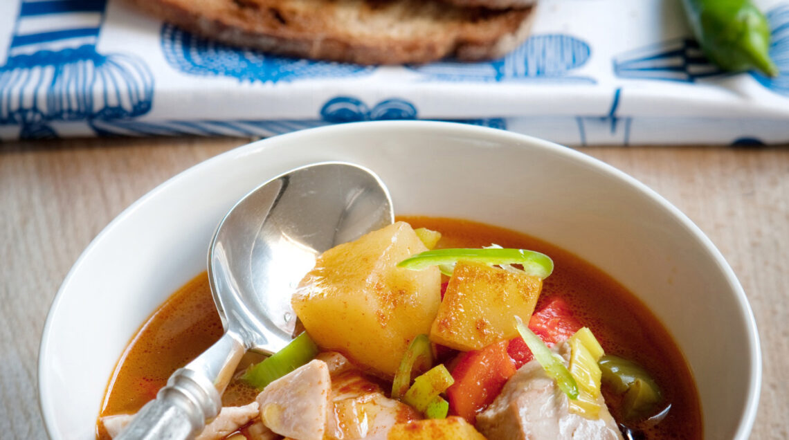 3) Trasferisci il tonno e le patate in una ciotola di servizio, filtra il brodo e rimettilo sul fuoco, poi unisci i peperoni, fai riprendere il bollore e cuoci per 5 minuti. Regola di sale. Versa la zuppa sul pesce e sulle patate e completa con il peperoncino verde fresco a fettine. Servi la zuppa basca di tonno e patate.