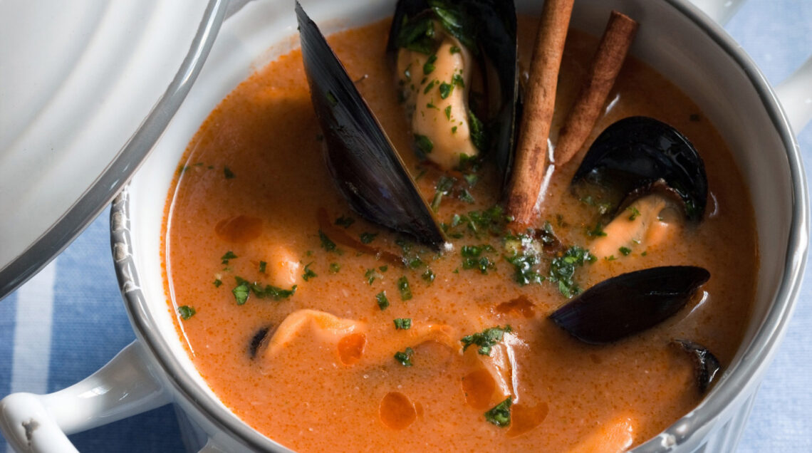 5) Aggiungi alla zuppa imolluschi sgusciati, 2 prese di cannella e un trito fine di prezzemolo e dell'aglio rimasto. Riscalda la zuppa di cozze alla catalana per un minuto e gustala nelle ciotole con le cozze intere e un filo d'olio.
