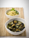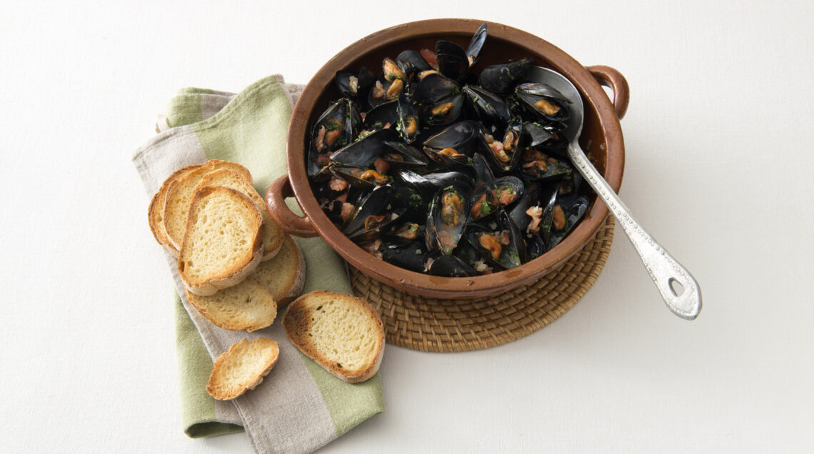 3) Rosola le cipolle con un filo d’olio in una pentola di coccio, quindi unisci i pomodori, le cozze e il fondo di cottura filtrato e cuoci per circa 10 minuti. Intanto, abbrustolisci le fette di pane in forno e strofinale con la testa d’aglio tagliata e metà. Aggiungi il prezzemolo alla zuppa e servila con le bruschette.