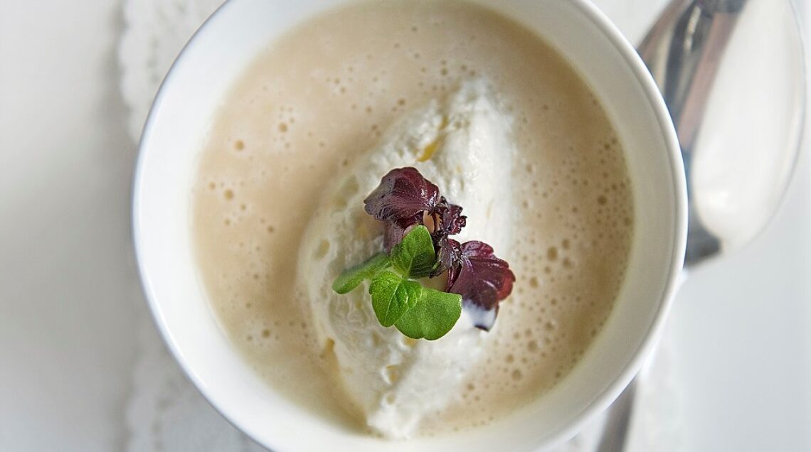 3) Rimettete la zuppa sul fuoco per scaldarla e, se vi piace, versate poco vino per darle più sapore. Suddividete nei piatti, montate la panna e distribuitene un cucchiaio in ciascuna porzione. Guarnite con un ciuffetto di foglioline aromatiche o germogli.