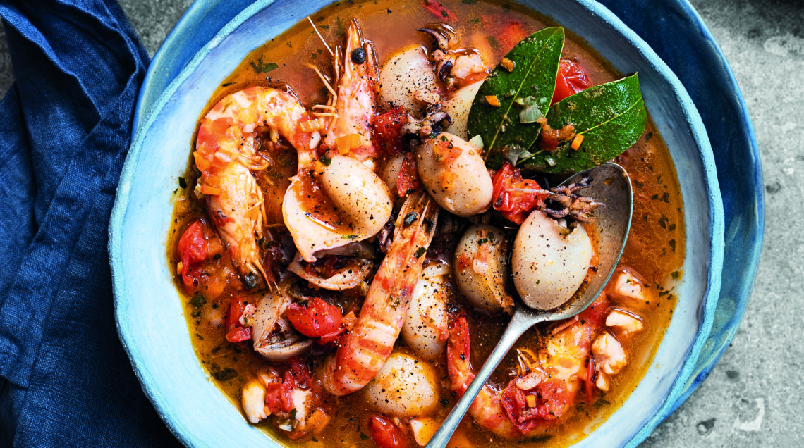 Il pesce rosola in un trito aromatico e poi sguazza nel pomodoro per offrire una zuppa superba. Accompagnata da fette di pane croccante profuma di cipollotto
