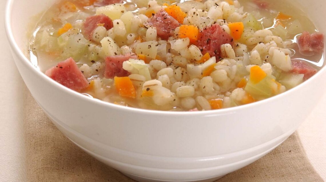 1) Mettete 200 g di orzo perlato in una pentola con 2 litri di acqua, una carota, una cipolla, 2 costole di sedano, un porro, una patata e uno spicchio d'aglio tutti tritati e 150 g di zampone a dadini.