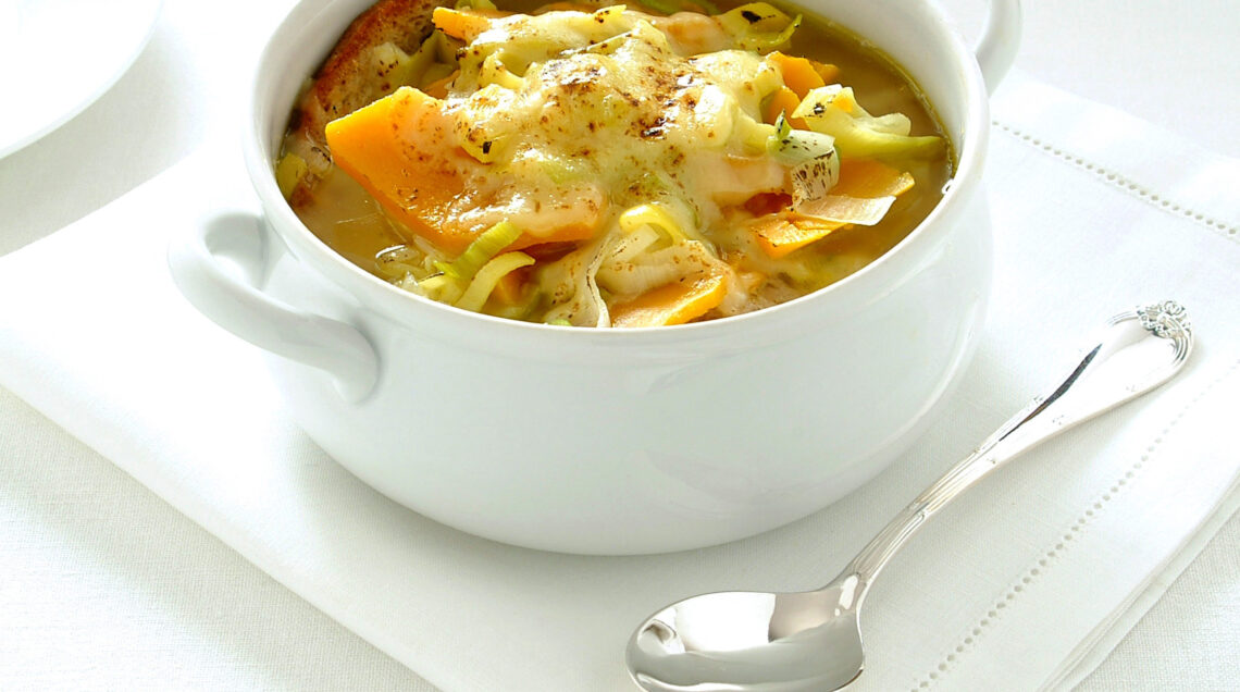 4) Disponi 4 fette di pane sul fondo di 4 pirofiline, cospargile con metà dell'Emmental grattugiato, fai uno strato di porri e zucca, poi ripeti gli strati terminando con il formaggio. Versa su tutto il brodo tenuto da parte e metti le pirofiline sotto il grill del forno già caldo fino a quando la superficie della zuppa gratinata sarà dorata (occorreranno circa 5 minuti). Servi subito.