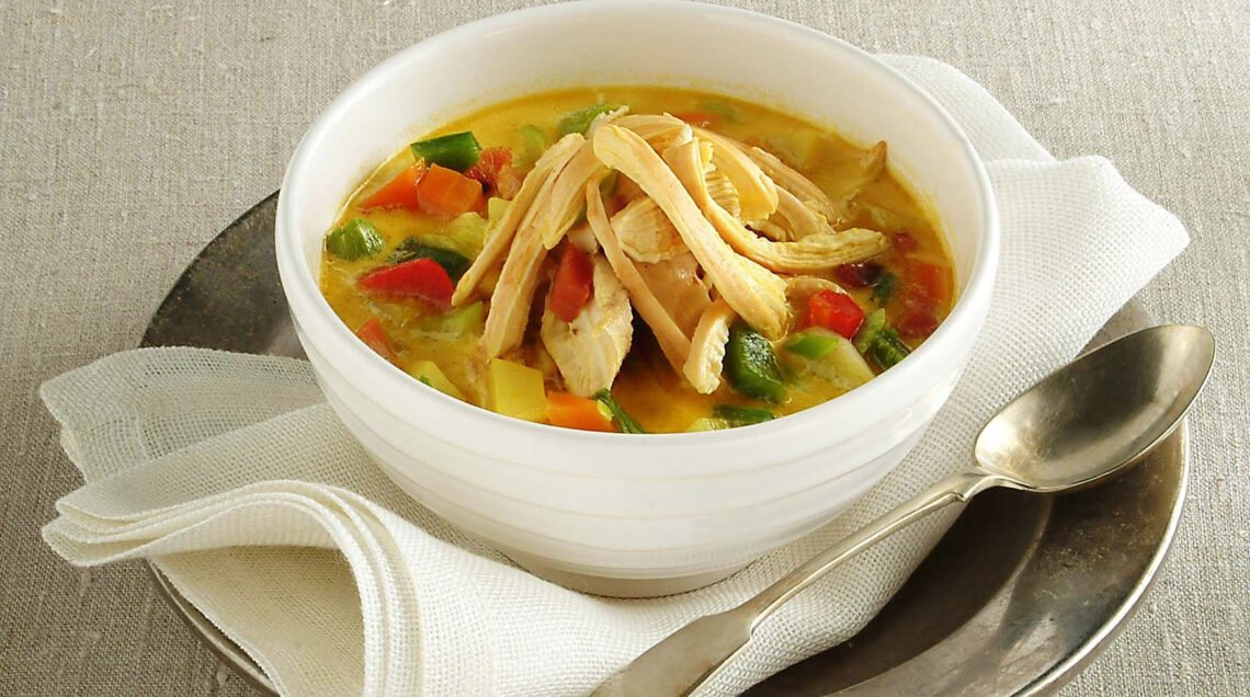 6) Alla fine della cottura della zuppa aggiungi una bustina di zafferano e 2 dl di panna. Guarnisci i piatti di zuppa adagiando le fettine di pollo.