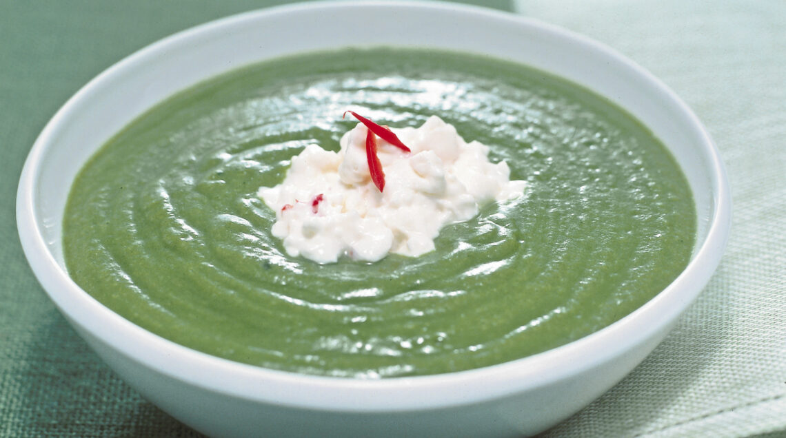 Ora tritate il peperoncino fresco, unitelo allo squacquerone e amalgamate per bene. Infine versate la zuppa, aggiungete in ogni piatto una cucchiaiata di squacquerone al peperoncino e servite subito.