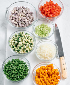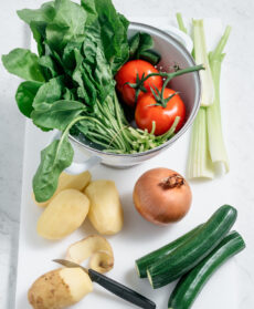 Sbucciate le patate e la cipolla e spuntate le zucchine e i fagiolini. Lavate tutte le verdure, compresi il sedano, le bietole, i pomodori e i fagioli.