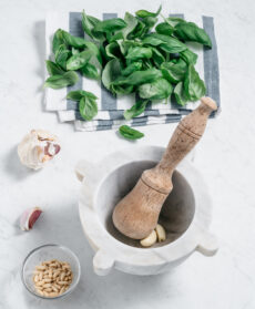 Nel frattempo, preparate il pesto. Lavate le foglie di basilico e asciugatele delicatamente. Sbucciate l'aglio e schiacciatelo nel mortaio con il pestello fino a ridurlo in crema. Unite prima i pinoli, continuando a pestare, quindi le foglie di basilico e un pizzico di sale, fino a ottenere un composto omogeneo.