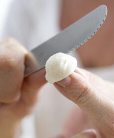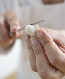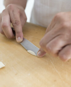 Capovolgete il dischetto di pasta ottenuto sul pollice sinistro incavandolo e modellate l'orecchietta aiutandovi davanti con la lama e dietro con 3 dita.