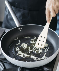 Tagliate a metà i pomodorini. Fate soffriggere la cipolla affettata in una padella con un filo di olio.