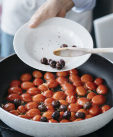 Unite al soffritto i pomodorini, mescolateli delicatamente per insaporirli, e dopo qualche minuto aggiungete le olive, mescolate e regolate di sale. Aggiungete nella padella la polpa del pesce spinata.