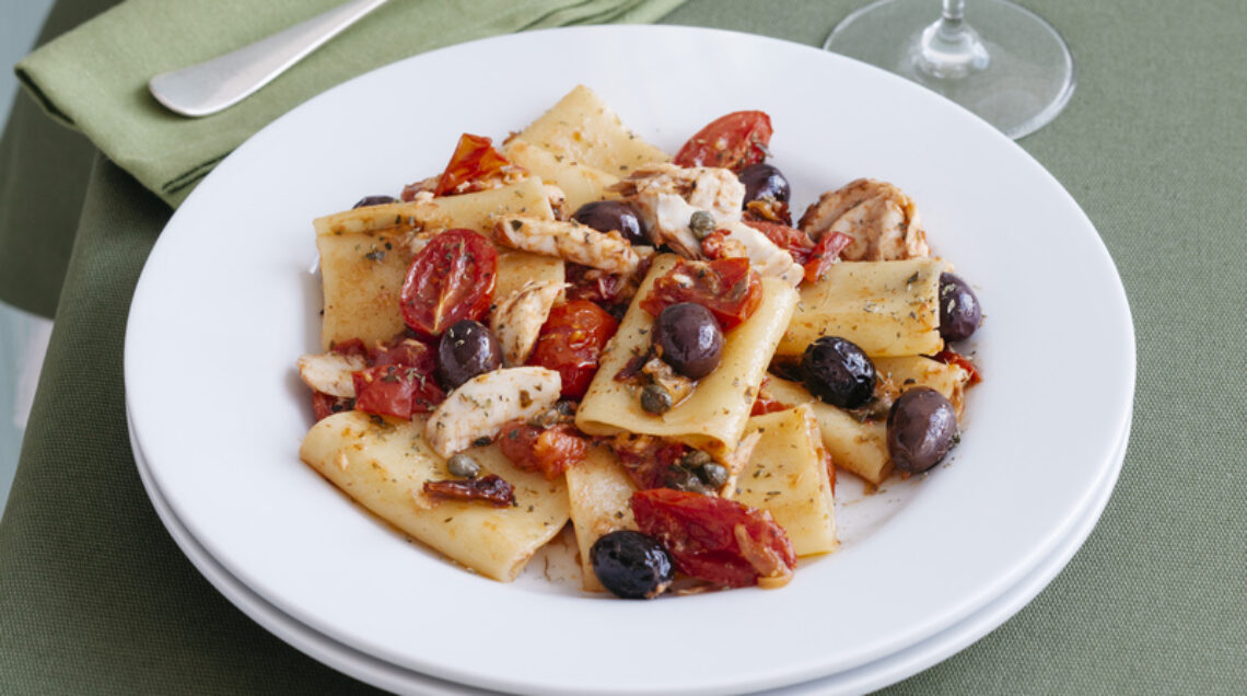 Si tratta di un goloso piatto di pasta condito con pomodorini, olive nere e il pesce gallinella. L'ideale per gli amanti dei sapori di mare e per chi non vuole rinunciare al classico piatto di pasta come prima portata durante un pasto.