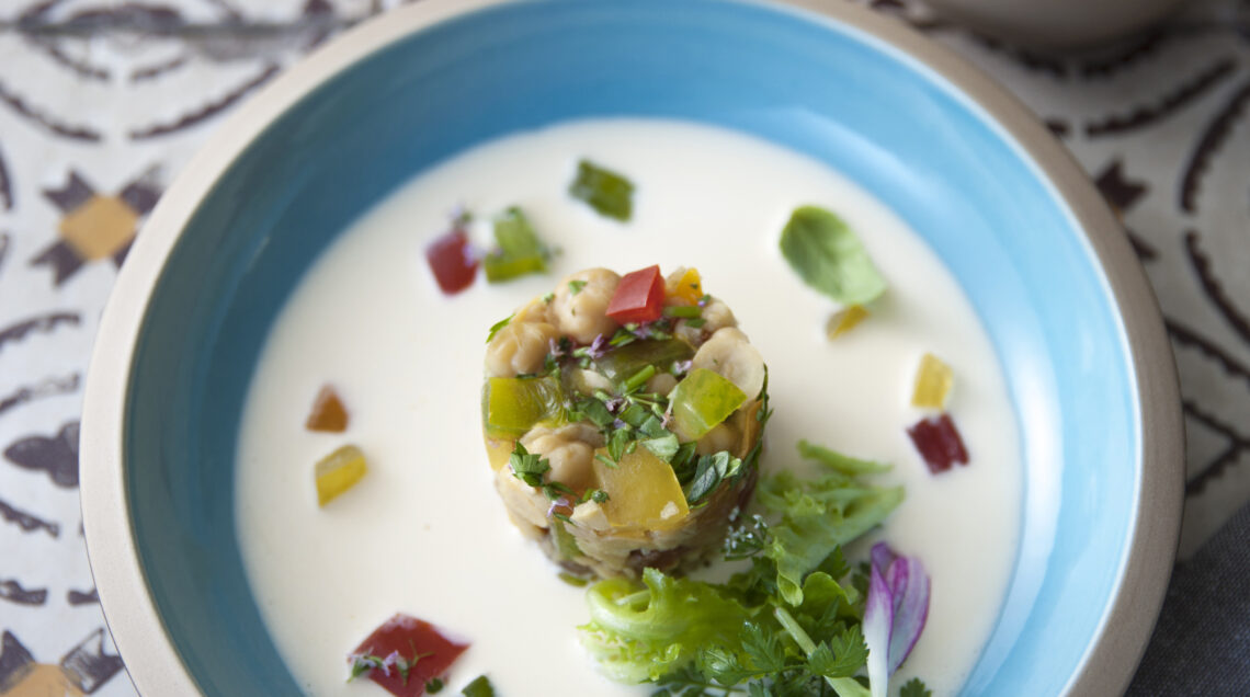 Estate è tempo di piatti freddi. Come questa crema che utilizza sia la mozzarella che il leggero latticello in cui è immersa. La salsa fluida che se ne ricava fa da base a una tartare di pomodori. Per un effetto ancora più gradevole, mescolatene di diverse qualità e colori: rossi, gialli, verdi o persino neri daranno un bel tocco cromatico oltre ad arricchire la preparazione di sfumature di gusto differenti.