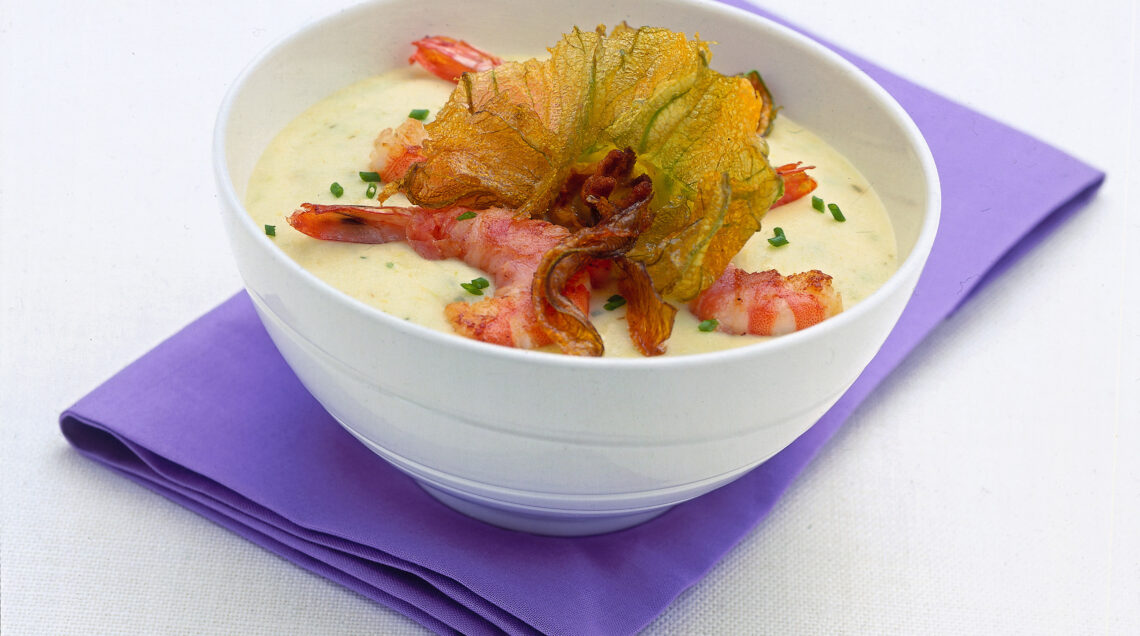 3) Servi la crema di patate e porri guarnita con i gamberi, i fiori di zucca fritti e i pezzetti di erba cipollina.