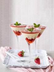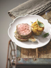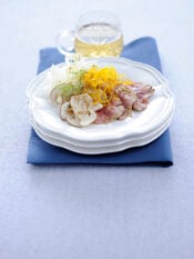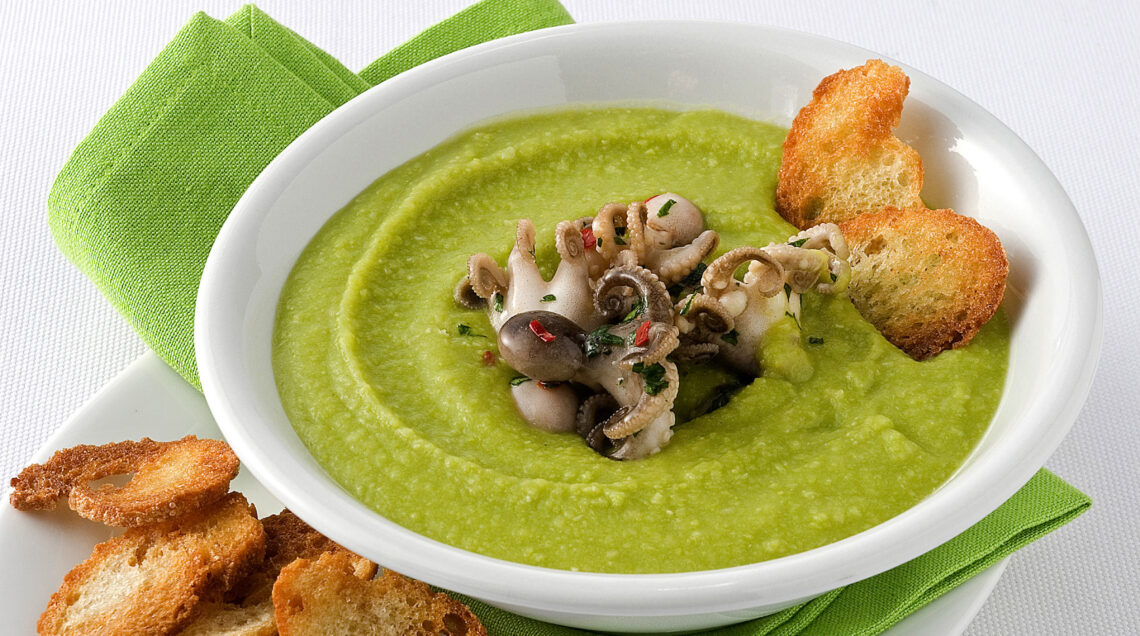 3) Distribuisci la crema vellutata di fave e patate nelle ciotole individuali e servila con i polpetti e i crostini di pane.