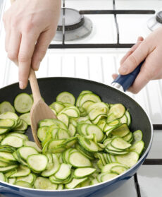 Lavate e spuntate le zucchine, ricavate con uno scavino alcune palline per la guarnizione e riducete il resto a rondelle sottili. Fate appassire le rondelle in una larga padella con una noce di burro e un pizzico di sale, con il coperchio, finché sono tenere, spegnete e lasciate intiepidire.
