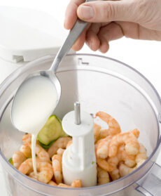 Trasferite nel mixer i gamberi spadellati, le zucchine appassite, la panna e frullate fino a ottenere un composto omogeneo.