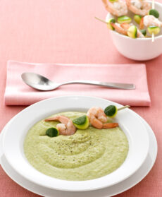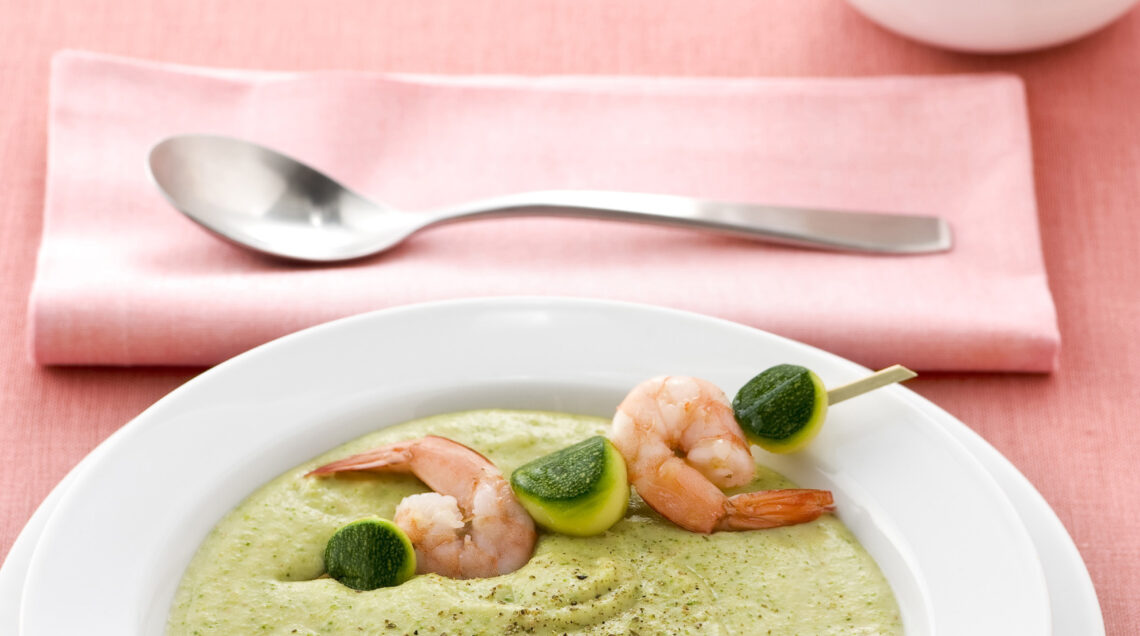 Questa crema ha una consistenza setosa, grazie a una base di salsa vellutata e all’aggiunta di panna fresca, e il gusto elegante dei gamberi, crostacei caratterizzati da una vena dolce che ben si armonizza con le zucchine.