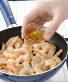 Sgusciate, private del filo nero e sciacquate le code di gambero, tenendone da parte alcune con le codine per la guarnizione. Scaldate un cucchiaio di olio in una padella, unite le code di gambero interamente sgusciate e fatele rosolare a fuoco vivo, mescolando. Salate e pepate, spruzzate con il brandy, alzate la fiamma e lasciatelo evaporare completamente.