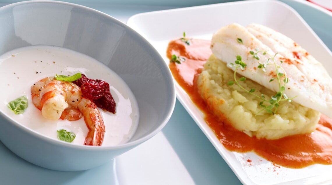 6) Disponete 2 gamberi in ciascun piatto singolo, aggiungete 3 datterini e cospargete con la vellutata preparata. Guarnite con foglioline di basilico e servite.