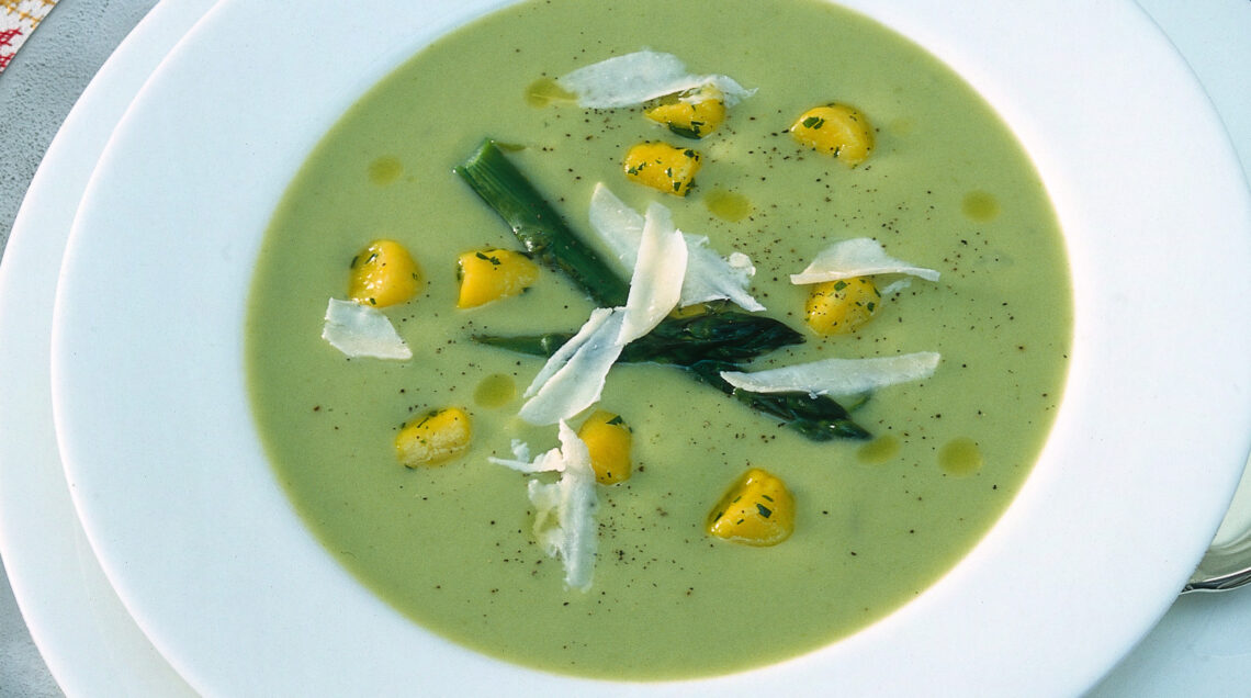 3) Cuoci gli gnocchi in una pentola con abbondante acqua bollente salata alla quale avrai aggiunto lo zafferano; scolali con un mestolo forato man mano che salgono in superficie, lasciali sgocciolare bene e uniscili alla vellutata. Distribuiscila nei piatti e guarniscila con le punte di asparagi, il grana e il basilico; condiscila con un filo d'olio e una macinata di pepe e servi.