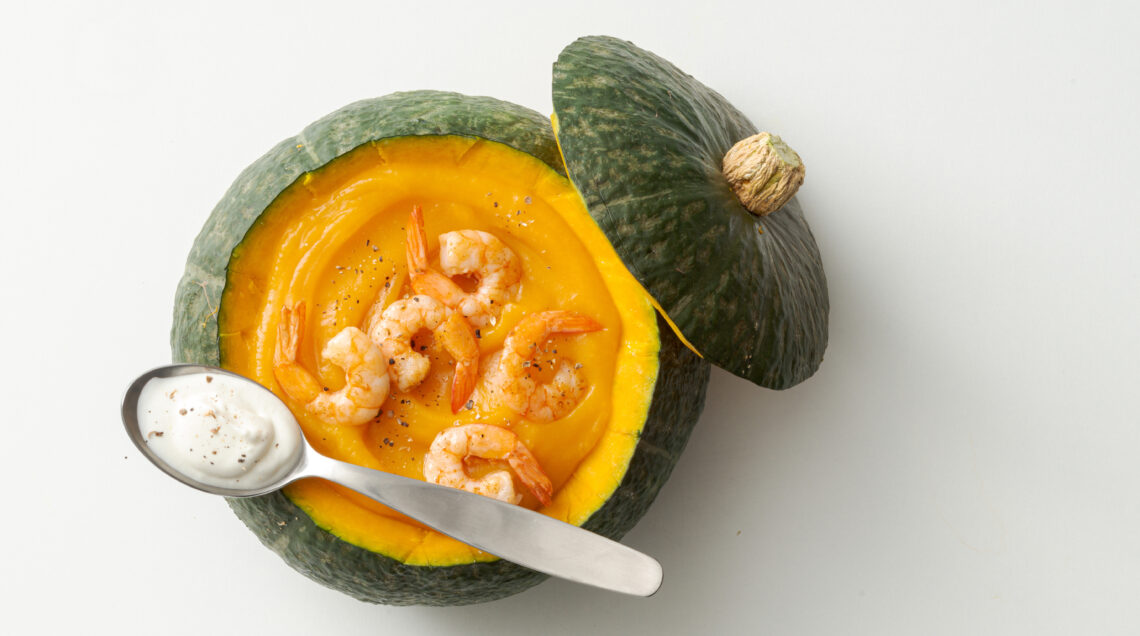 Un crema voluttuosa di zucca e panna servita con gamberi appena lessati e profumata allo zenzero. Scenografica la presentazione per un piatto che conquista al primo cucchiaio