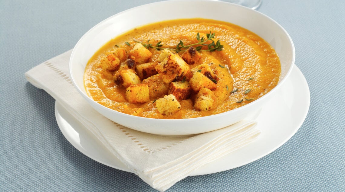 4) Versa la crema di zucca con i crostini di panettone speziati nei piatti singoli, poi decora il piatto con un rametto di timo e gustala ben calda.